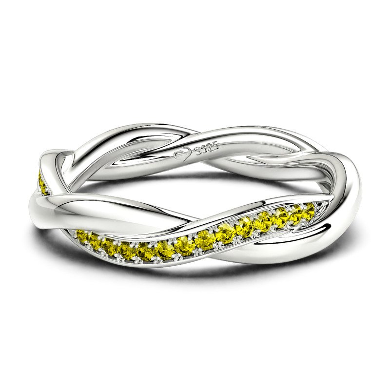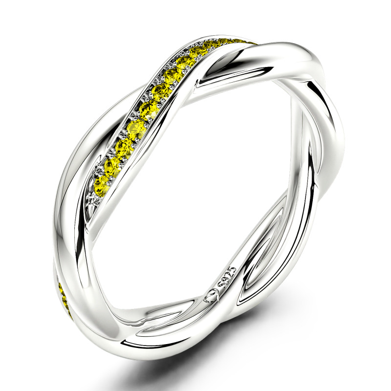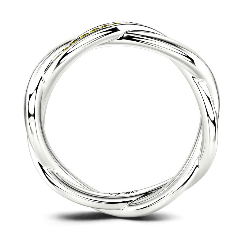 A twisted wedding ring that has two bands intertwined in a vine-like fashion. This beautiful and delicate wedding ring is formed by two intertwining bands, one of micropave set stones and one of solid 10K/14K/18K Gold Platinum for an elegant statement.