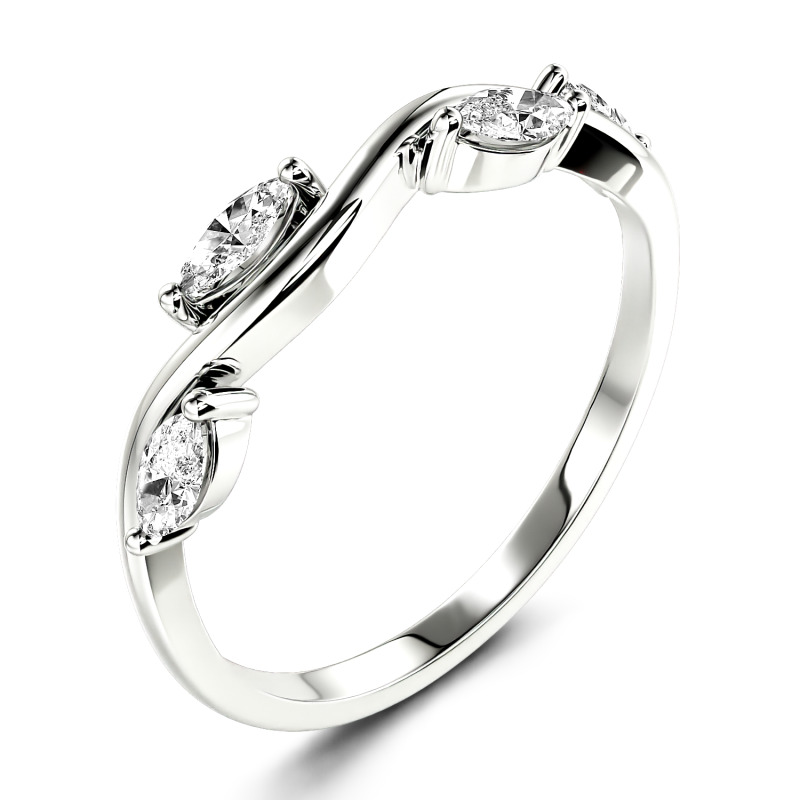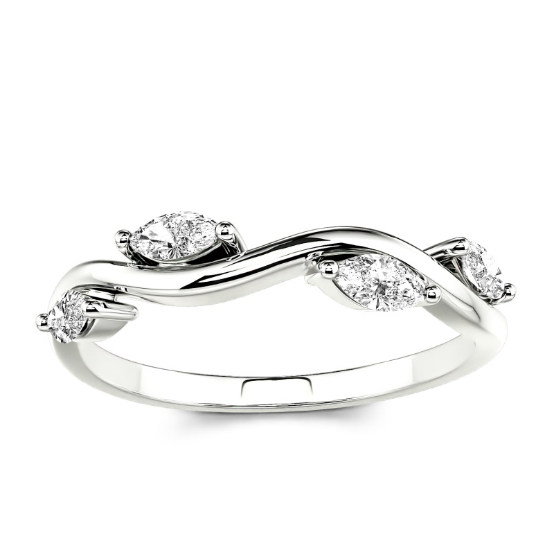 This whimsical ring is wonderfully designed into a branch and leaf shape with the dainty curve outlining four marquise-cut glistening stones. The shining moissanite leaves nestle quietly and lively on the slender branch. Graceful, low-pitched, and timeless, the lovely feminine ring is ideal for an anniversary gift or everyday accessory. She will fall in love with the simple but unique style at the first sight.