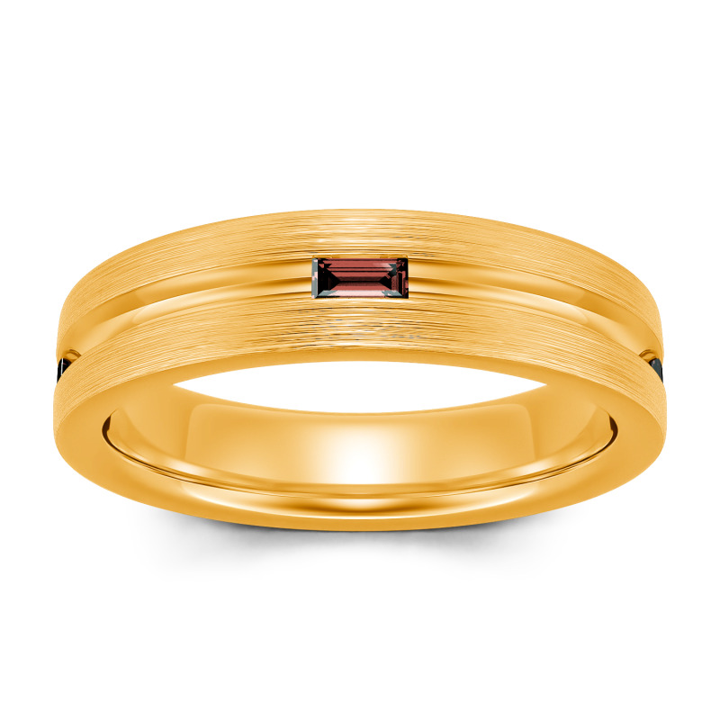 He'll appreciate the distinctive look of this fashion-forward wedding band. This unique ring features a high polish groove inlaid within a contemporary matte band. The alluring emerald-cut stones add an eye-catching flair. A streamlined style just for him, this wedding band is a modern expression of your affection.