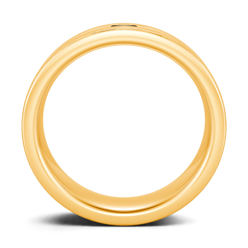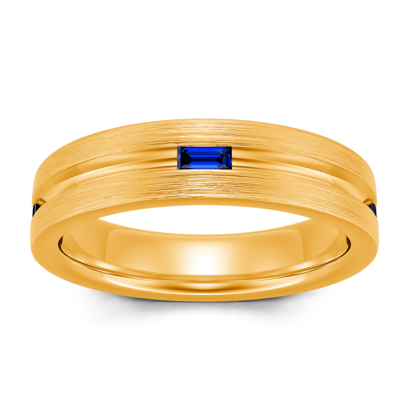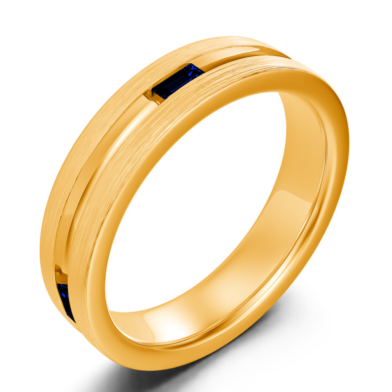 He'll appreciate the distinctive look of this fashion-forward wedding band. This unique ring features a high polish groove inlaid within a contemporary matte band. The alluring emerald-cut stones add an eye-catching flair. A streamlined style just for him, this wedding band is a modern expression of your affection.