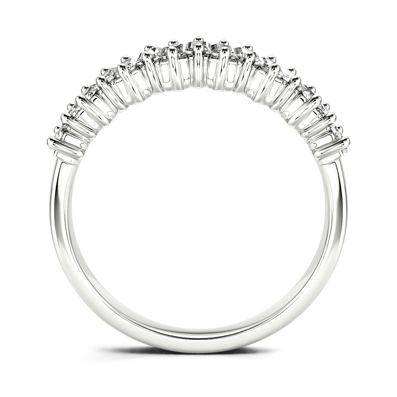 Promise to love, honor and cherish her with this charming moissanite wedding band. An alternating wave of emerald-cut stones dazzle along one third of the band for a modern and lustrous look. Perfect for all-day wear, the inside of the shank is rounded for comfort. On your wedding day or wedding anniversary, present her with a band that represents an eternity of love.