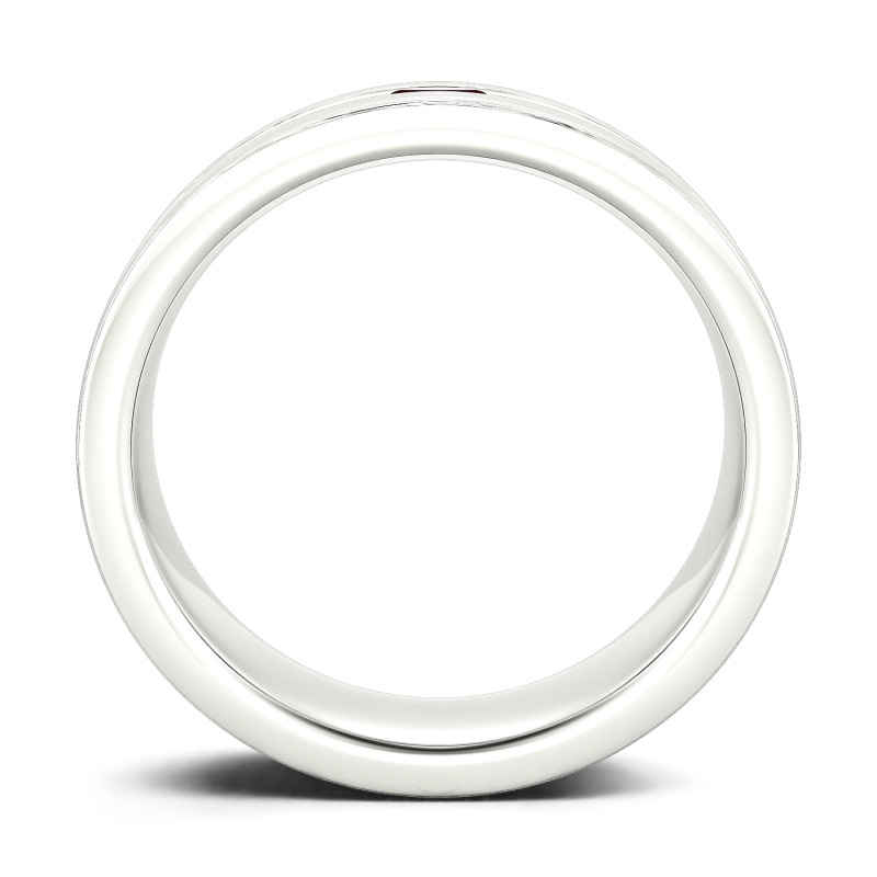 He'll appreciate the distinctive look of this fashion-forward moissanite wedding band. This unique ring features a high polish groove inlaid within a contemporary matte band. The alluring emerald-cut stones add an eye-catching flair. A streamlined style just for him, this wedding band is a modern expression of your affection.