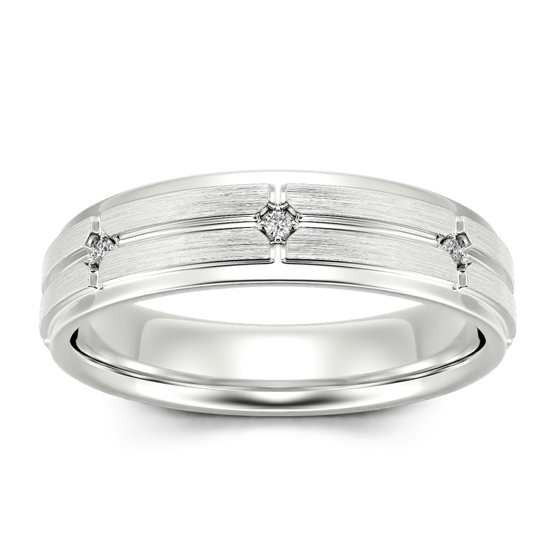With smart details, this moissanite wedding band is a unique look for him. This sophisticated look showcases a grooved grid pattern dotted with shimmering round-cut stones. Stepped edges add further modern detail to the design. Begin your lifetime of love with this handsome wedding band for him.