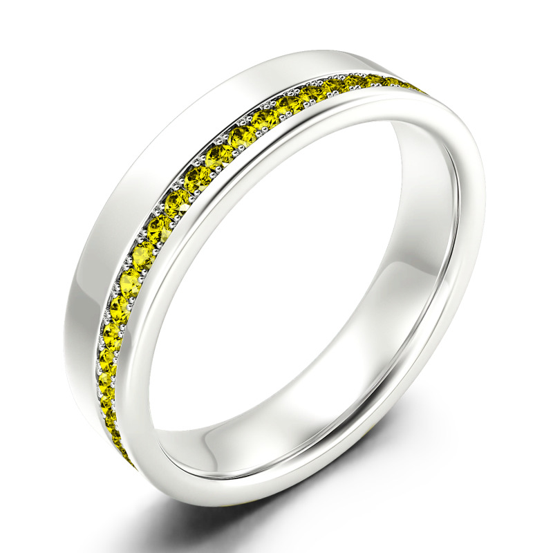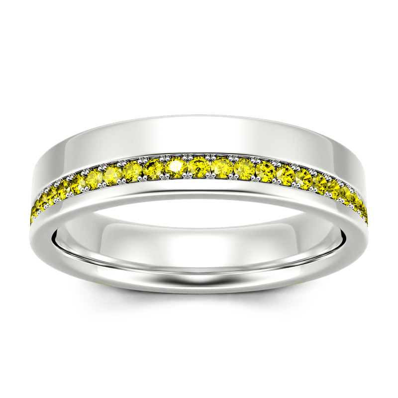On your anniversary or wedding day, honor the man you love with a ring worthy of his affections. This unique design features a ribbon of petite channel-set stones along the edge of the modern polished look. Buffed to a brilliant shine, this ring is an elegant symbol of your marriage commitment.