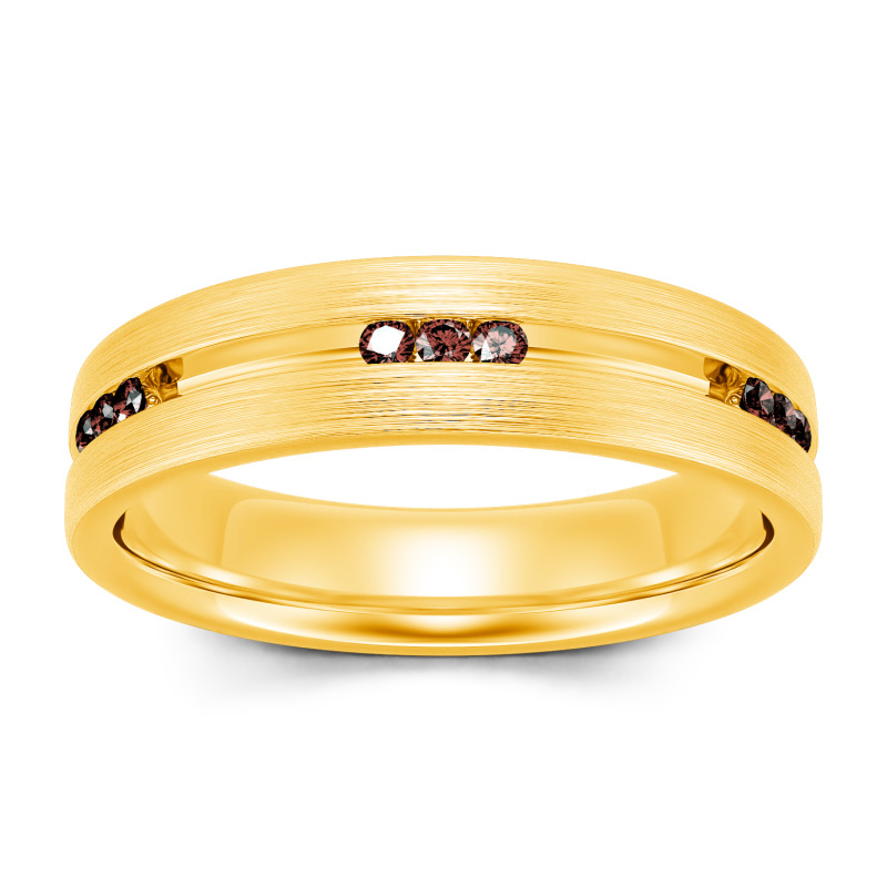 Smart and sophisticated, this wedding band is a handsome choice for your special day. This contemporary ring showcases channel-set stones that sparkle along the center of the band in an elegant satin finish while a matte-brushed interior adds a touch of design-forward uniqueness. On the day you say "I do," place this dazzling moissanite wedding band on his finger.