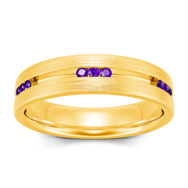 Smart and sophisticated, this wedding band is a handsome choice for your special day. This contemporary ring showcases channel-set stones that sparkle along the center of the band in an elegant satin finish while a matte-brushed interior adds a touch of design-forward uniqueness. On the day you say "I do," place this dazzling moissanite wedding band on his finger.