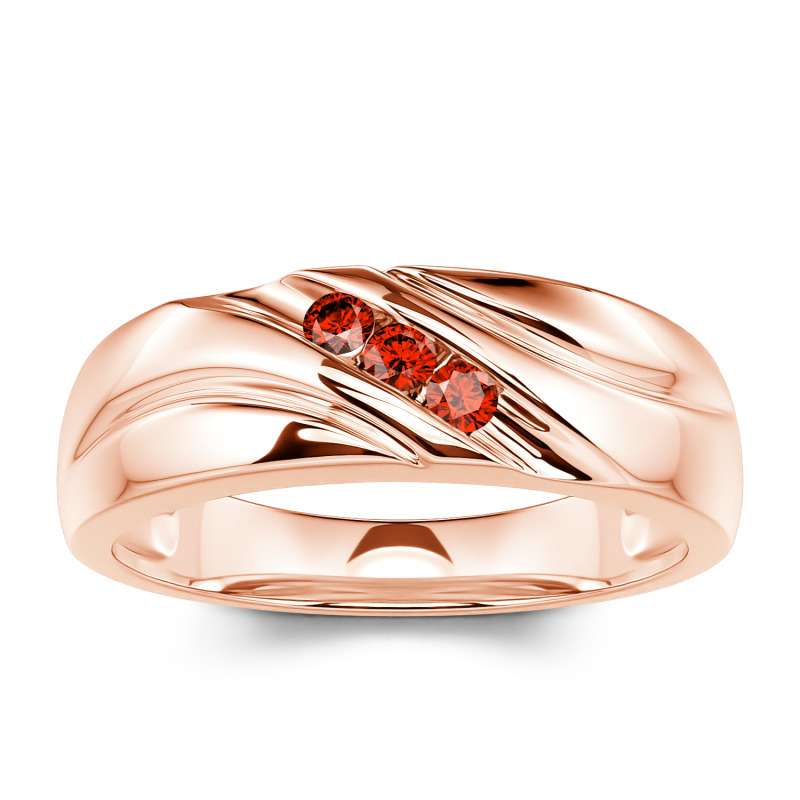 Contoured lines and a trio of moissanite flow along this handsome men's wedding band. This piece is highlighted by a diagonal stripe of three round stones adding a touch of eye-catching style. The perfectly polished finish, together with the striking shine of channel-set stones, is definitely a fashionable choice for him.