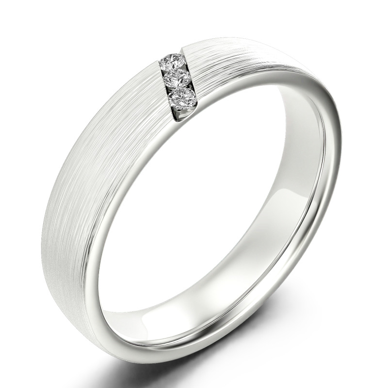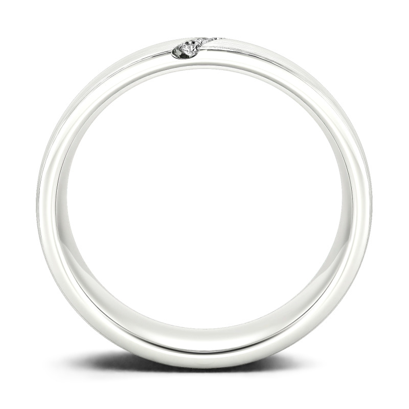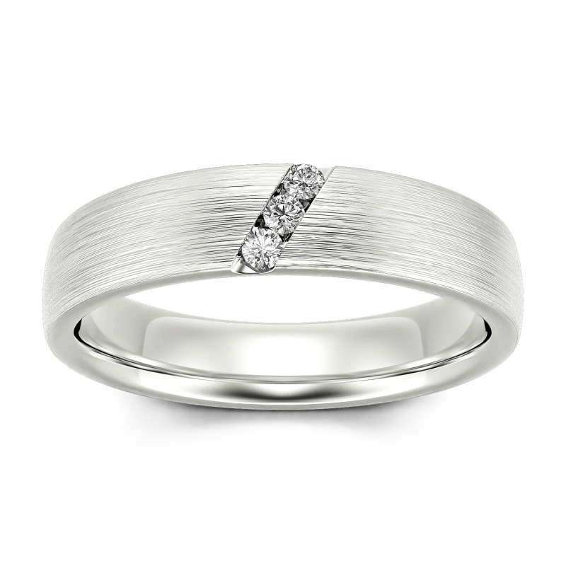 He'll appreciate the sleek design of this moissanite wedding band. A striking diagonal line of stones creates a unique, eye-catching design in this matte-brushed ring. The inside of the shank is rounded for comfortable wear. Buffed to a brilliant luster, this comfort-fit wedding band seals your vows in style.
