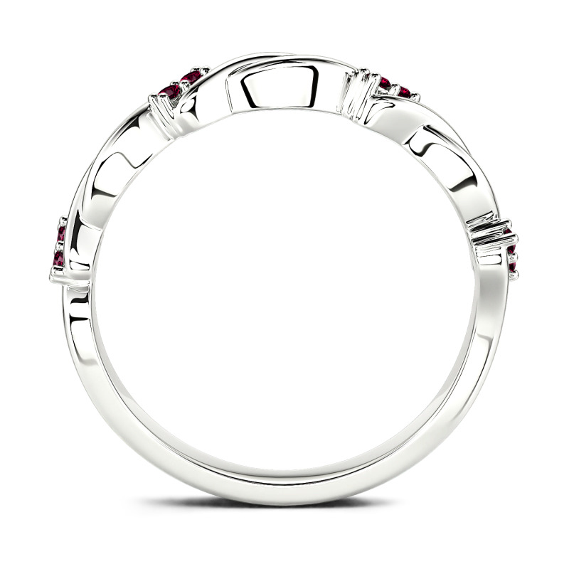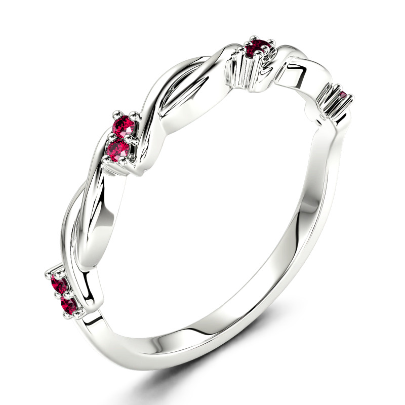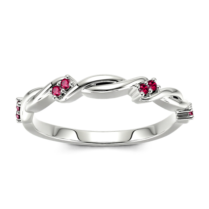 A look she'll treasure, this sparkling moissanite twist band marks your latest chapter with style. Ribbons of high polished precious metal appear gracefully woven together and adorned with clusters of sparkling stones in this unique and whimsical ring. Gleaming with your love, this slender wedding band is a true reminder of your everlasting love.