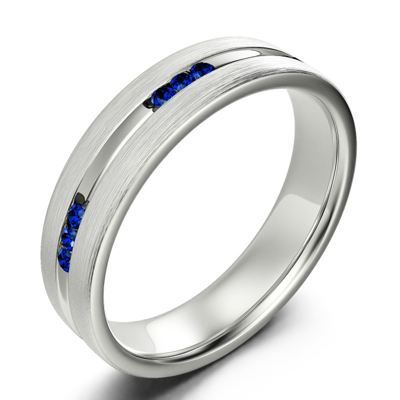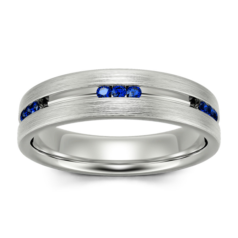 Smart and sophisticated, this wedding band is a handsome choice for your special day. This contemporary ring showcases channel-set stones that sparkle along the center of the band in an elegant satin finish while a matte-brushed interior adds a touch of design-forward uniqueness. On the day you say "I do," place this dazzling wedding band on his finger.
