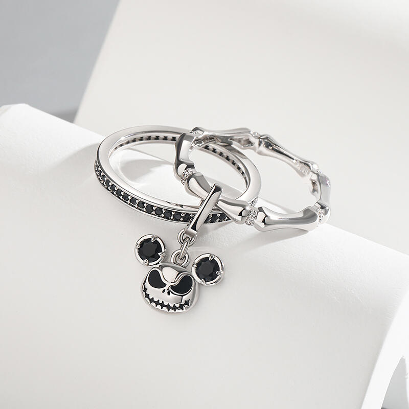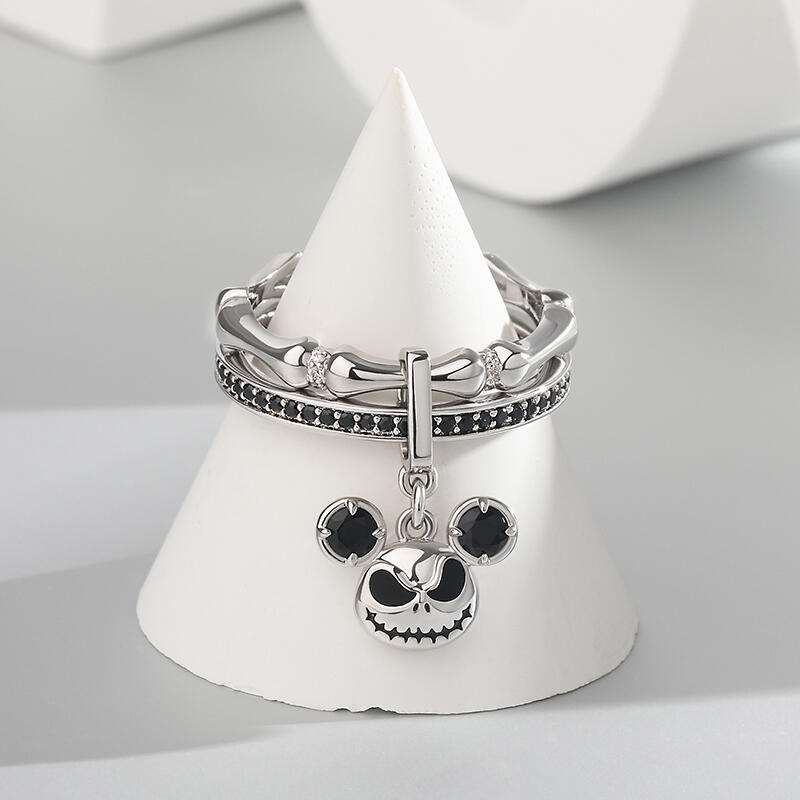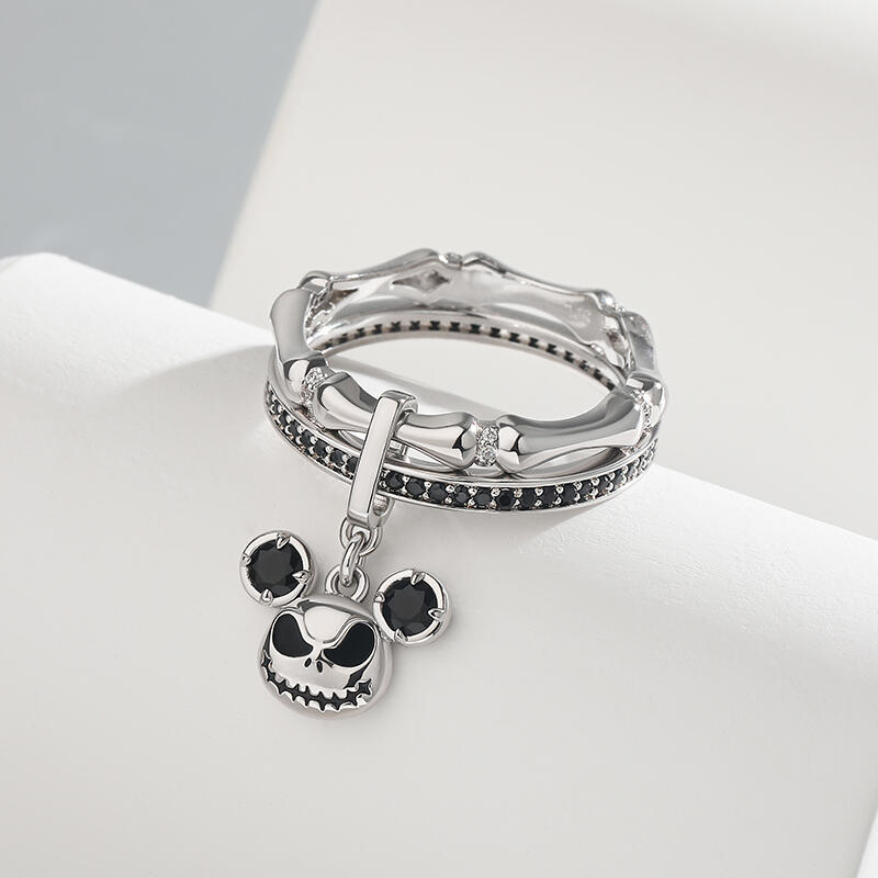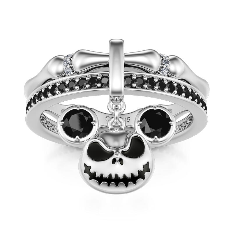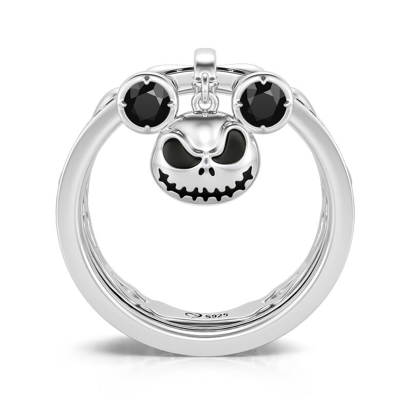 Chic and adorable, this cute skull dangle ring is perfect for fans of "Pumpkin King". Detailedly crafted in sterling silver, this band is twice as nice, with a polished bone half that perfectly balances with a row of round stones. The cute "Pumpkin King" head with cartoon mouse ears as charm on this band: it gently moves with you as you go through your day. Never miss it.