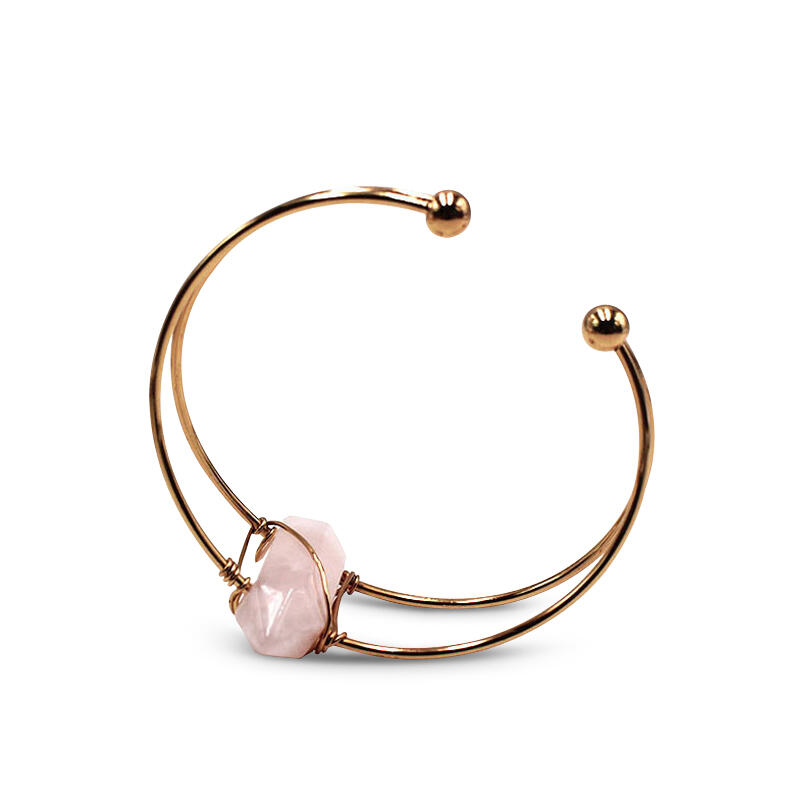 Carry unconditional love everywhere with our rose quartz double layer bangle bracelet. Rose quartz, a crystal of unconditional love, carries a soft, gentle energy of compassion and peace. It is a healing crystal of tenderness, nourishment, and comfort. These soft pink gems speak directly to the heart chakra, dissolving emotional wounds, fears, and resentments. It circulates loving energy throughout the entire aura, helping us to heal from past wounds and move forward with courage. Reawakening the heart to its own innate love, rose quartz provides a deep sense of personal fulfillment and contentment.